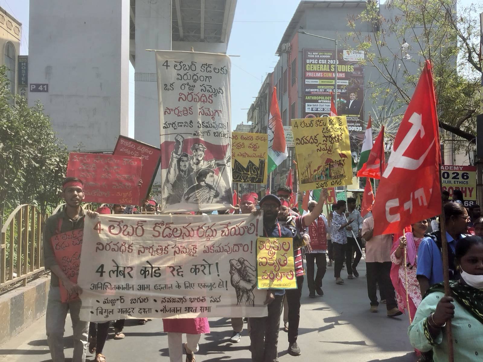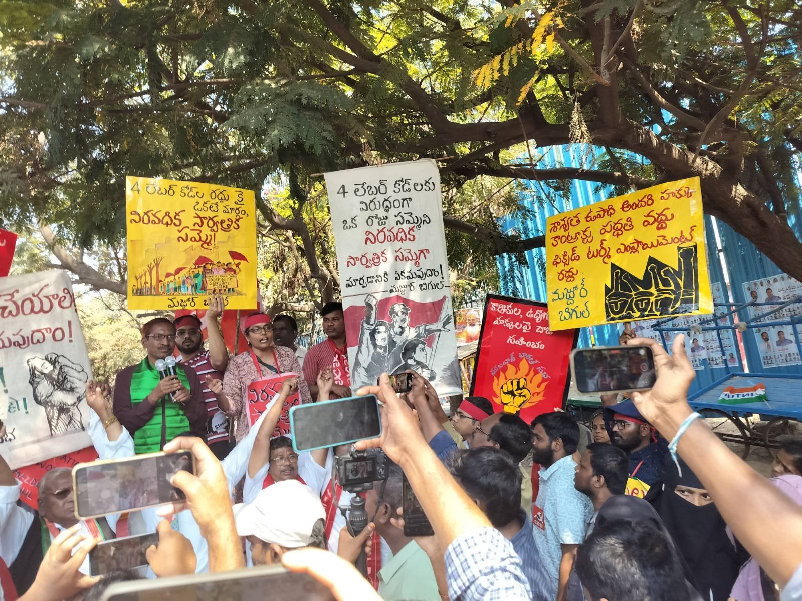 तेलंगाना की राजधानी हैदराबाद में ‘मज़दूर बिगुल तेलुगू’ की टीम ने देशव्यापी आम हड़ताल में भाग लिया। ‘मज़दूर बिगुल’ की ओर से साथी भार्गवी ने हड़ताल के लिए एकजुट हुए सैकड़ों मज़दूरों-कर्मचारियों को बधाई देते हुए बात रखी। भार्गवी ने कहा कि मोदी सरकार के चार लेबर कोड आज़ादी के बाद मज़दूरों के अधिकारों पर अब तक का सबसे बड़ा हमला हैं। मोदी सरकार के रुख़ से यह स्पष्ट है कि वह 1 अप्रैल से इन कोड को लागू करने के लिए कमर कस चुकी है। ऐसे में एकदिवसीय रस्मी हड़ताल से इस फ़ासीवादी सरकार के कान पर जूँ तक नहीं रेंगने वाली है। समय गया है कि मज़दूर वर्ग अपने अमोघ अस्त्र यानी अनिश्चितकालीन आम हड़ताल का इस्तेमाल करे। हाल के वर्षों में यह देखा गया है कि मोदी सरकार तभी झुकी है जब प्रदर्शनकारी अपनी माँग पूरी होने तक डेरा डालकर बैठ जाते हैं। अब मज़दूर वर्ग को अगर अपनी ग़ुलामी के दस्तावेज़ यानी चार लेबर कोड से निजात चाहिए तो उसे एक या दो दिन की हड़ताल नहीं बल्कि अनिश्चितकालीन आम हड़ताल के रास्ते पर जाना होगा। भार्गवी ने  पिछले कुछ महीनों में इस काले क़ानून के ख़िलाफ़ ‘मज़दूर बिगुल’ द्वारा चलाये गये अभियानों का हवाला देते हुए कहा कि तमाम मज़दूर और कर्मचारी चार लेबर कोड को रद्द करवाने के लिए अनिश्चितकालीन आम हड़ताल के रास्ते पर जाने के लिए तैयार हैं। उन्होंने इन लेबर कोड को रद्द करने, वीबी-ग्रामजी क़ानून को रद्द करने और मनरेगा को बहाल करने एवं नयी पेंशन स्कीम की बजाय पुरानी पेंशन स्कीम को लागू करने की माँग उठायी।