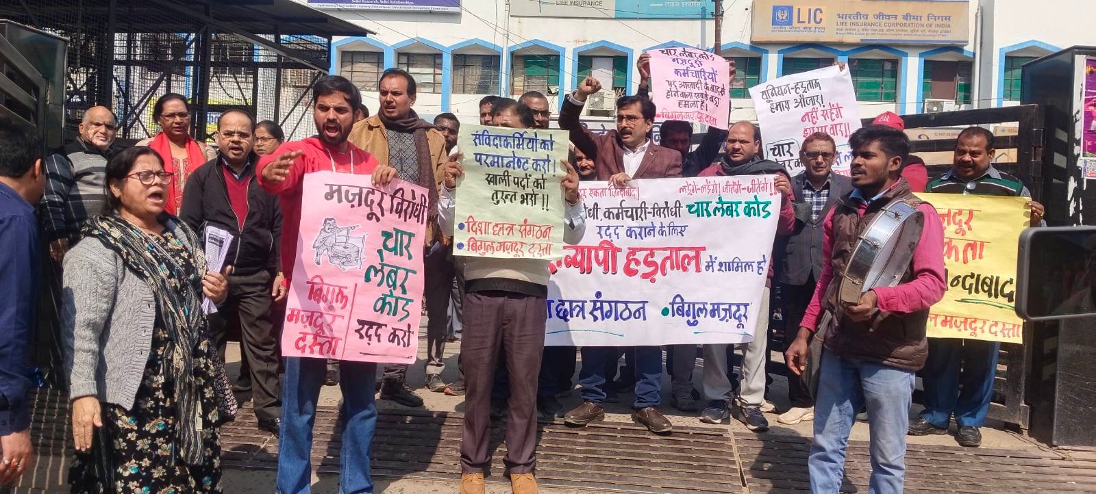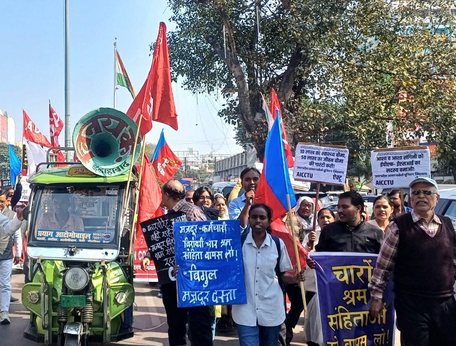 इलाहाबाद में ‘बिगुल मज़दूर दस्ता’ और ‘दिशा छात्र संगठन’ ने मिलकर दिसम्बर माह से चार लेबर कोड के ख़िलाफ़ अभियान की शुरुआत की। शुरू में अभियान मुख्यतः लेबर चौराहों और नगर निगम के सफाई कर्मचारियों की मज़दूर बस्तियों को लक्षित करते हुए चलाया गया। साथ ही, सरकारी विभागों में कर्मचारियों से मिलने और कार्यालयों में पर्चा वितरण का सिलसिला चलता रहा। इलाहाबाद जंक्शन, प्रयाग जंक्शन, प्रयागराज संगम जंक्शन, फूलपुर रेलवे स्टेशन पर अभियान चलाया गया। इस दौरान यह बात बार-बार रेखांकित हुई कि ज़्यादातर विभागों में यूनियनों ने हड़ताल अथवा चार लेबर कोड के सवाल पर कर्मचारियों के बीच में कुछ भी नहीं किया। डाक, नेशनल इंश्योरेंस, रेलवे, बीएसएनएल, पीडब्ल्यूडी, सिंचाई  आदि विभागों के अधिकांश कर्मचारियों को हड़ताल के बारे में हमलोगों से जानकारी मिली। सरकारी विभागों के कर्मचारियों के एक बड़े तबके को लेबर कोड के बारे में जानकारी ही नहीं है। केन्द्रीय ट्रेड यूनियनों ने इस हड़ताल के लिए न तो प्रचार चलाया और न ही अपने सदस्यों को शिक्षित-प्रशिक्षित करने पर कोई विशेष ज़ोर दिया। हड़ताल की रैली में भी आँगनबाड़ी और आशाकर्मियों की एक बड़ी संख्या के अलावा अन्य विभागों से कोई उल्लेखनीय भागीदारी नहीं रही।