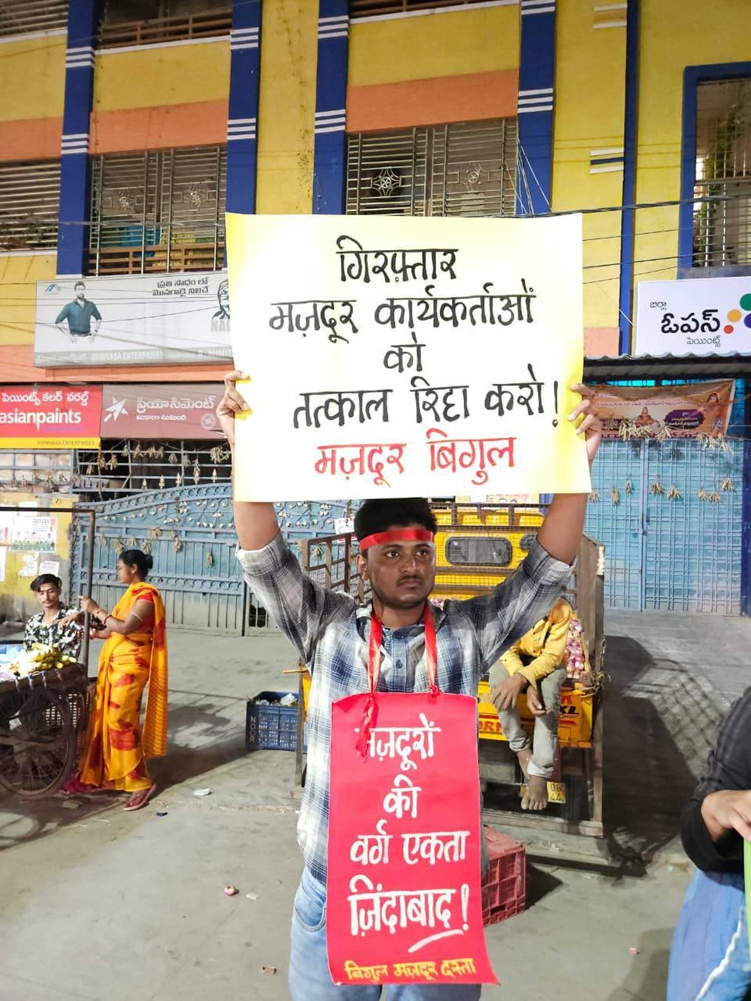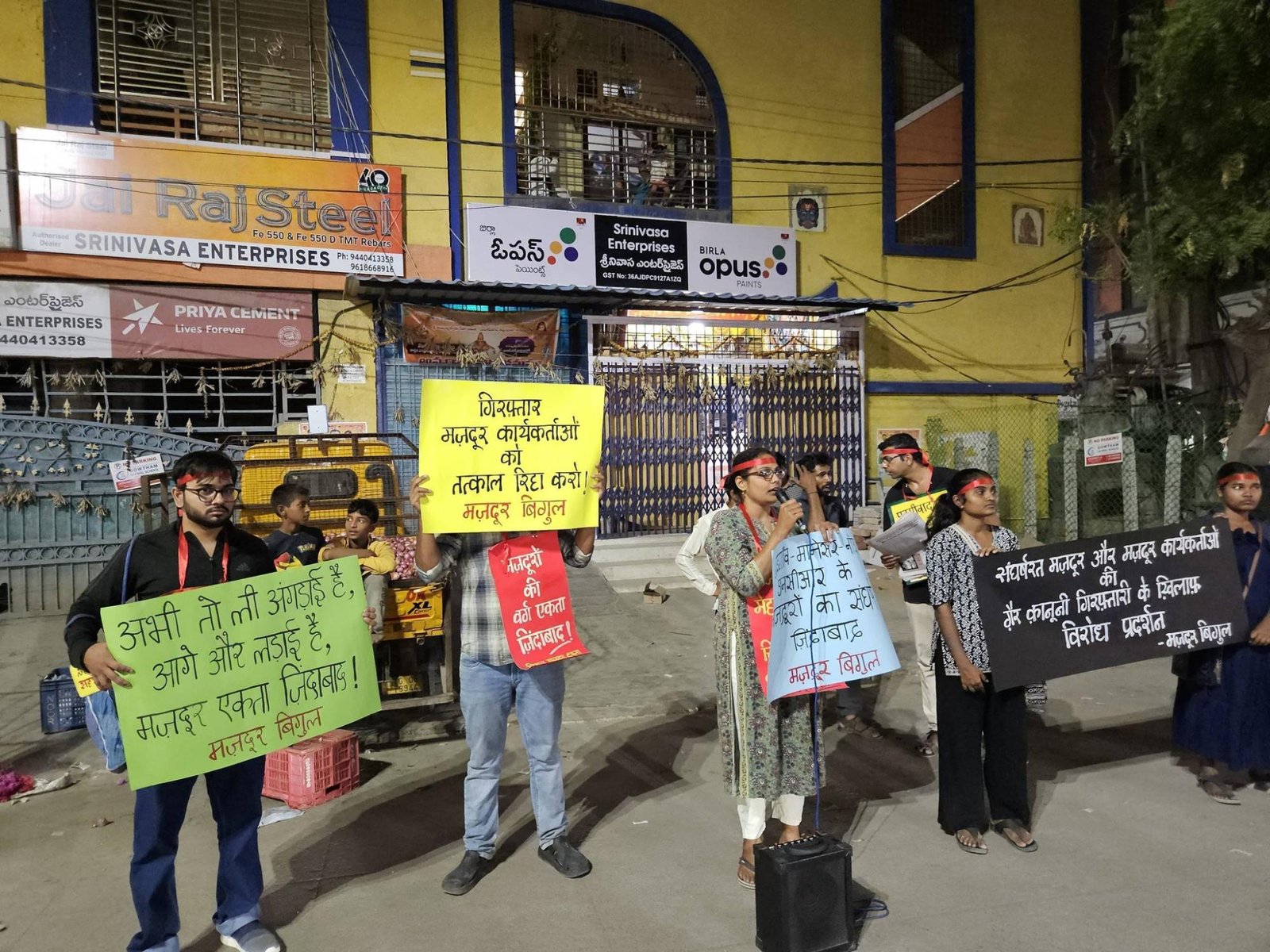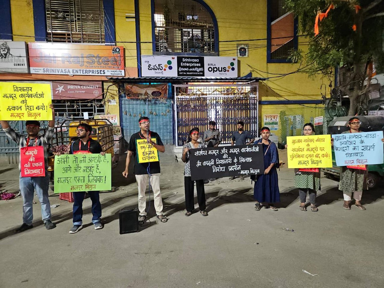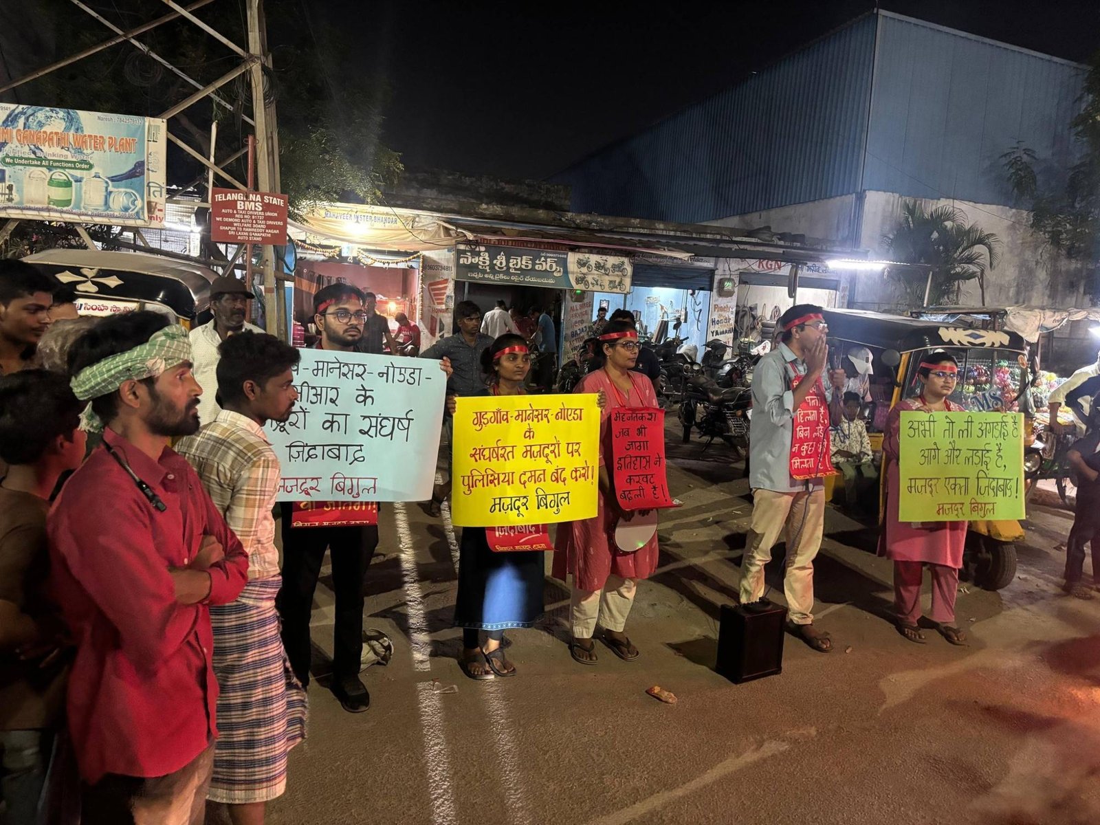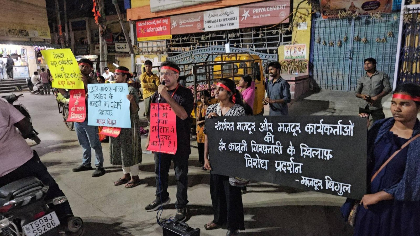 हैदराबाद के जीडीमेटला औद्योगिक क्षेत्र में गुड़गाँव, मानेसर और नोएडा के संघर्षरत मज़दूरों व मज़दूर कार्यकर्ताओं की गैर-कानूनी गिरफ़्तारियों के ख़िलाफ़ विरोध प्रदर्शन।