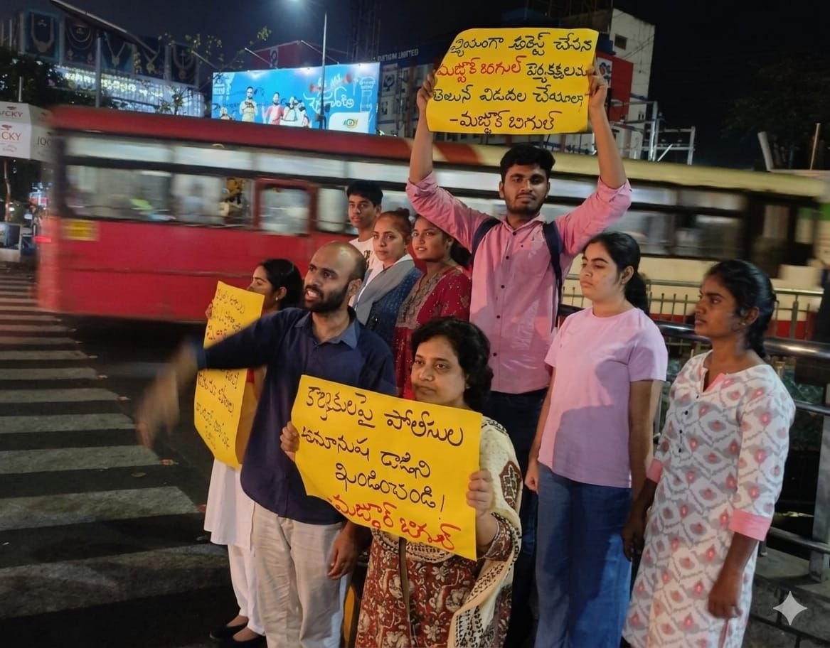 Mazdoor Bigul and Naujawan Bharat Sabha activists held a protest in Visakhapatnam on Sunday evening, opposing the brutal police attack on workers and the arrest of Mazdoor Bigul activists who were supporting the workers’ in their struggle.