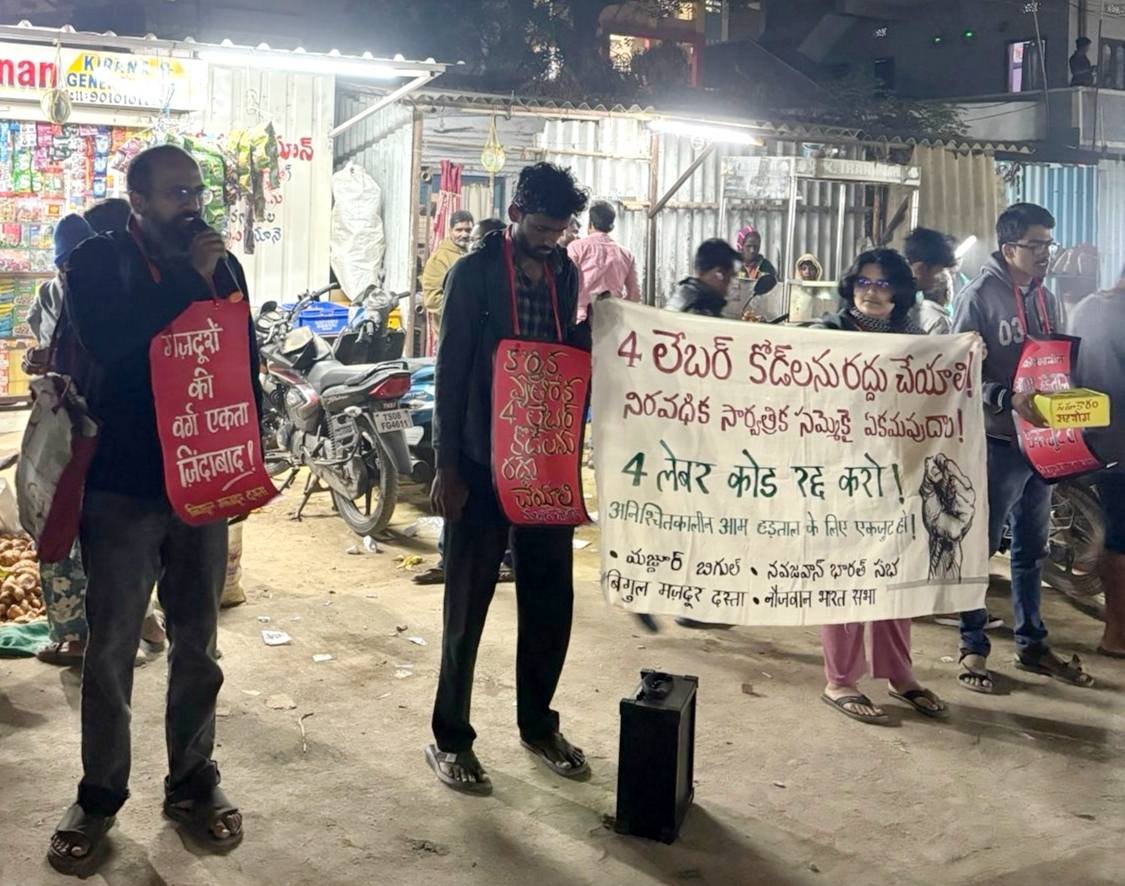 बिगुल मज़दूर दस्ता ने गत 27 दिसम्बर को हैदराबाद के जीडीमेटला औद्योगिक क्षेत्र में स्थित मज़दूर बस्ती रामि रेड्डी नगर में चार लेबर कोड के विरोध में नुक्कड़ सभा करते हुए जुलूस निकाला। नुक्कड़ सभा के दौरान मज़दूरों को चार लेबर कोड के मज़दूर-विरोधी चरित्र को उजागर किया गया।
