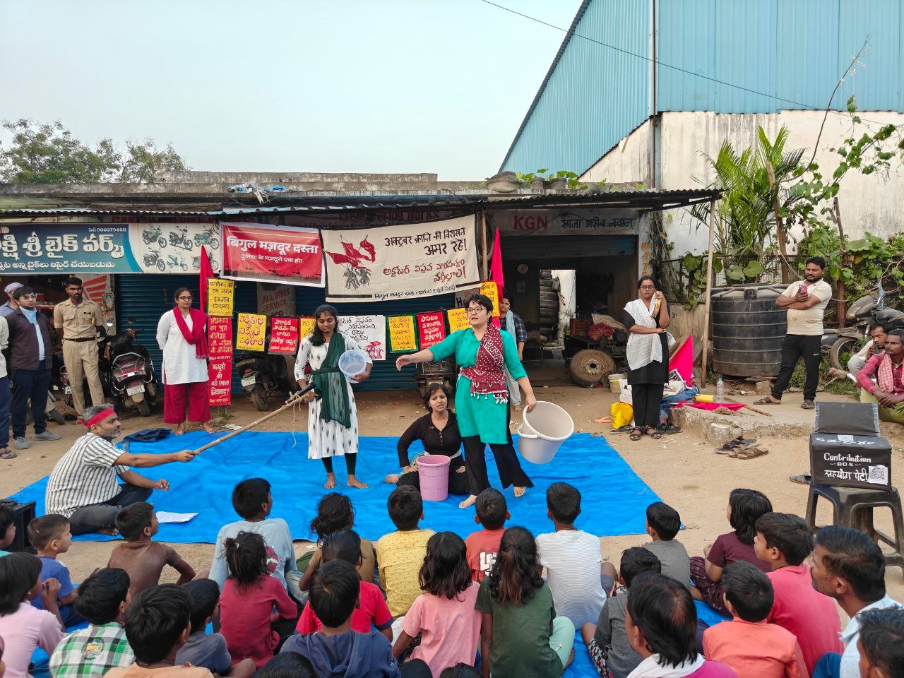 बीते 9 नवम्बर 2025 की शाम को हैदराबाद के जीडीमेटला औद्योगिक क्षेत्र में स्थित रामिरेड्डी नगर मज़दूर बस्ती की गलियाँ नारों, और क्रान्तिकारी गीतों से गूँज उठीं। अवसर था बिगुल मज़दूर दस्ता द्वारा महान अक्टूबर क्रान्ति की 108वीं वर्षगांठ के अवसर पर आयोजित एक सांस्कृतिक कार्यक्रम का। इस अवसर पर सफ़दर हाशमी के नाटक पर आधारित नाटक — ‘कहानी एक मेहनतकश औरत की’ और ‘मशीन’ — का मंचन भी किया गया। दोनों नाटकों ने मज़दूर वर्ग के जीवन के संघर्ष और उसकी ताक़त को जीवन्त रूप में प्रस्तुत किया। आसपास की फ़ैक्ट्रियों और बस्तियों से लगभग 500 लोग कार्यक्रम को देखने के लिए इकट्ठा हुए, जिनमें स्त्री-पुरुष मज़दूर और बच्चे शामिल थे।
