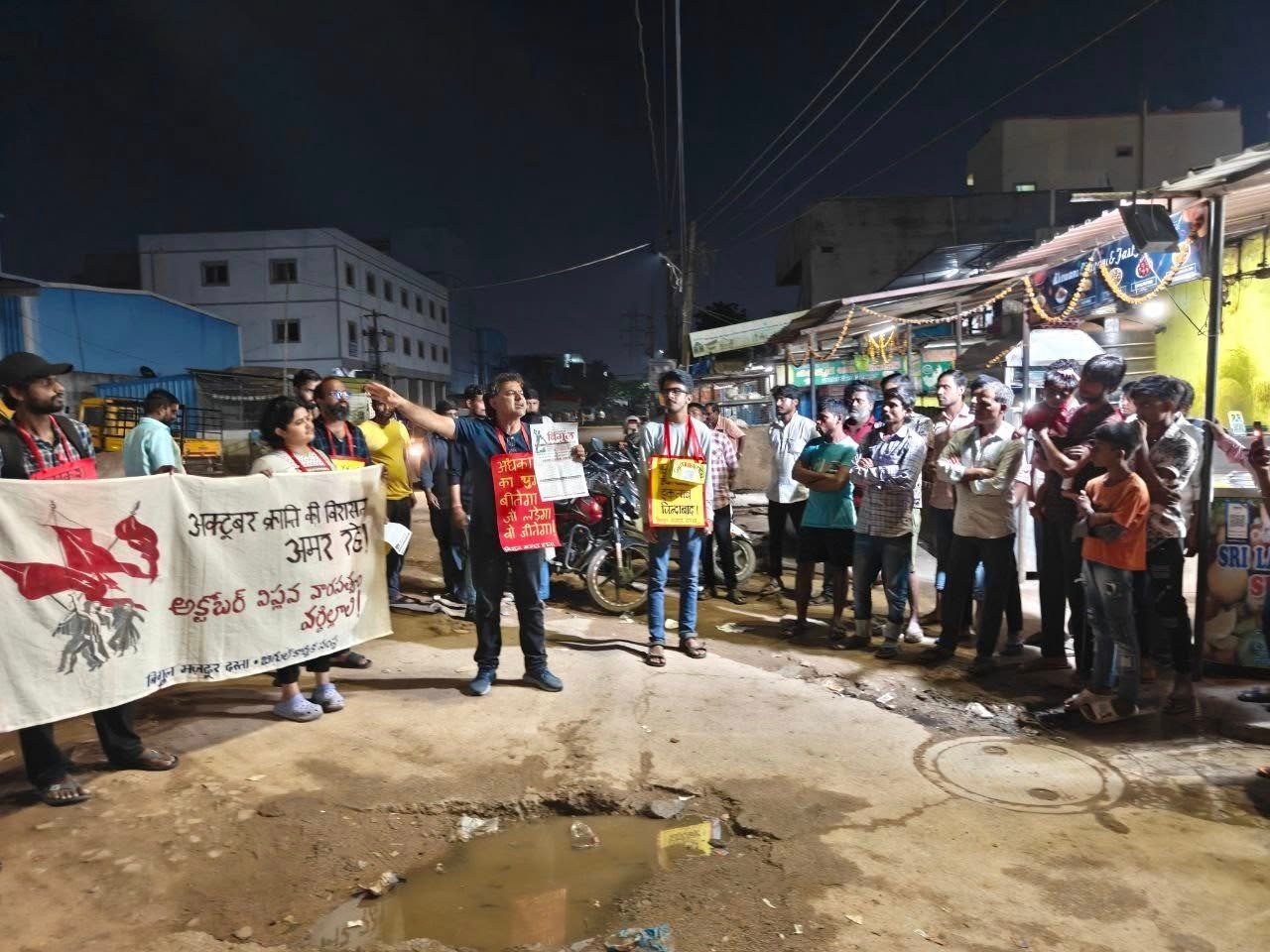 महान अक्टूबर क्रान्ति की 108वीं वर्षगाँठ के अवसर पर बिगुल मज़दूर दस्ता ने गत 26 अक्टूबर को हैदराबाद के जीडीमेटला औद्योगिक क्षेत्र के पास स्थित मज़दूर बस्ती रामिरेड्डी नगर में क्रान्तिकारी नारों के साथ जुलूस निकाला, पर्चे बाँटे और जनसभाओं के ज़रिये अक्टूबर क्रान्ति के इतिहास और उसकी विरासत के बारे में मज़दूरों को जागरूक किया।मजदूरों को बताया गया कि 108 वर्ष पहले रूस में मज़दूरों ने अक्टूबर क्रान्ति के ज़रिये अपना शासन स्थापित कर लिया था और पूँजीपति वर्ग के शासन को उखाड़ फेंका था। मज़दूरों ने अपने शासन की स्थापना कर दुनिया को दिखा दिया था कि जो हाथ मशीनें चलाते हैं, वे सरकार भी चला सकते हैं। इस क्रान्ति ने न सिर्फ़ मज़दूरों का जीवन बदला बल्कि पूरे समाज की संरचना को आमूलचूल रूप से परिवर्तित कर दिया था। मज़दूरों के राज यानी समाजवाद में पहली बार ऐसा हुआ कि मज़दूरों का श्रम मुट्ठी भर मालिकों के मुनाफ़े के लिए नहीं, बल्कि पूरे समाज की भलाई के लिए लगाया गया। मज़दूरों को भोजन, वस्त्र, आवास, शिक्षा, स्वास्थ्य सहित सभी बुनियादी हक़ हासिल हुए और वे इंसान की तरह जी सके। जिन्होंने अन्न उगाया वे भूख से नहीं मरे, जिन्होंने मकान बनाए उन्हें रहने के लिए घर मिला, जिन्होंने अपने श्रम से मशीनें चलाईं उन्होंने देश भी चलाया। उस समाज में ग़रीबी, भुखमरी, बेरोज़गारी, भ्रष्टाचार और वेश्यावृत्ति जैसी समस्याओं का समाधान हो गया था।